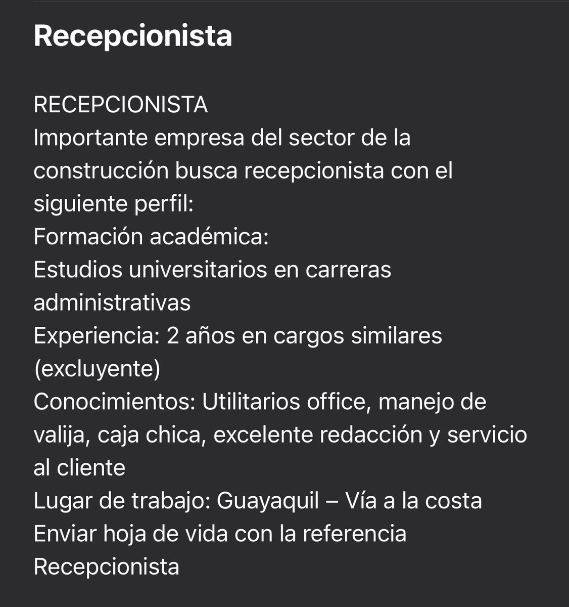 Allí los aspirantes podrán conocer las bases de postulación y aplicar directamente. Llamame al 0994348305 y te agendó una entrevista para una gran oportunidad de empleo en donde se ingresa puede trabajar desde casa. Es posible que indeed sea remunerado por estas empresas, lo cual ayuda a mantener gratis a indeed para los candidatos. Crea una alerta por email, recibe nuevas ofertas y no te pierdas otra oportunidad de trabajo.