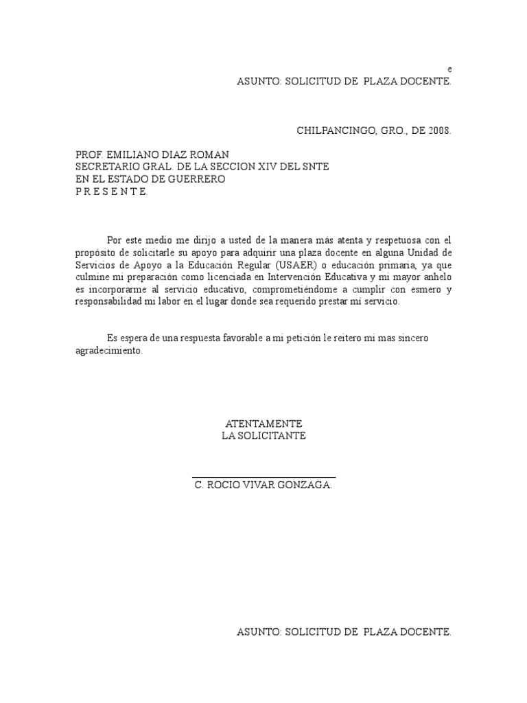 Solicitud De Plaza Vacante De Trabajo. Soy egresada de la escuela de maestros del estado, después de haber cursado la carrera de docente. Cuando estamos bucando un empleo, puede que alguna amistad o familiar nos indiquen la existencia de una vacante en una determinada empresa.