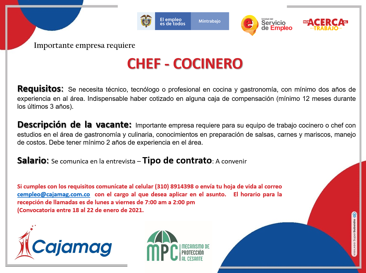 Vacante De Trabajo Chef. Tiempo completo, medio y parcial para chef. Chef creativo, con amplia experiencia en planificación y dirección de actividades culinarias y de preparación de alimentos, creación y reingeniería de menú.